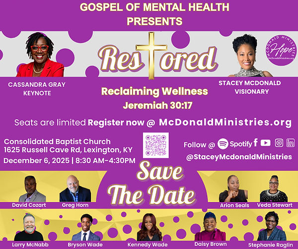 Stacey McDonald is a practicing school psychologist, evangelist, motivational speaker and a former lead pastor of ten years. Having a father with schizophrenia, as well as her own personal battle with depression, mental health awareness is more than her lived experience, it is her call and passion.